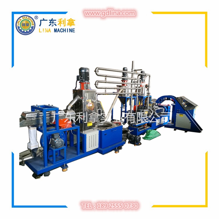 雙錐喂料機(jī)--150單螺桿擠出機(jī) -----自動(dòng)過濾換網(wǎng)器(不停機(jī))--—電磁快速保溫加熱器----開車閥---水下切粒機(jī)——脫水分離機(jī)——分類特制振動(dòng)篩———成品粒料儲(chǔ)料筒
